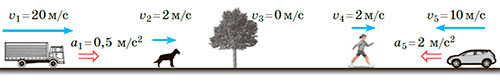 4. На рисунку зображено кілька тіл. 1) З яким тілом ви пов’язали б СВ, щоб вона була інерціальною? неінерціальною? Відповідь обґрунтуйте. 2) Якою в даний момент часу буде швидкість руху собаки в СВ, пов’язаній із пішоходом; у СВ, пов’язаній із вантажівкою? 3) Яким буде прискорення руху автомобіля у СВ, пов’язаній із деревом; у СВ, пов’язаній із пішоходом?