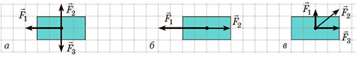 5. На рисунку зображено тіла та сили, що на них діють (1 клітинка — 2 Н). Знайдіть напрямок і модуль рівнодійної сил, що діють на кожне тіло.
