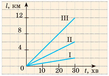 3. На рисунку зображені графіки шляхів для пішохода, велосипедиста й трактора, які рухаються зі швидкостями 4, 12 і 24 км/год відповідно. Який із зображених графіків якому тілу відповідає? Побудуйте графіки швидкості руху зазначених тіл.