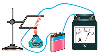 Дослід виконується, щоб показати залежність опору від температури. Тут використовується пальник, провідник з великим опором, з’єднувальні провідники, джерело живлення (батарейка) та амперметр.