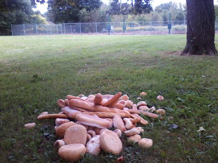 За даними, які я знайшов у Мережі, американці викидають 150 тисяч тонн усіляких продуктів на день. І це не вигадка і не наклеп - я особисто ПОСТІЙНО бачу в смітниках нашого апартмент-комплексу купи різної їжі. А фото, яке над цим текстом, я зробив зовсім недалеко від місця нашого проживання. Навіщо і чому хтось викинув мішок хліба на газон – не знаю! З жиру, гади, дуріють! .gif)